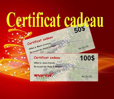 Nos certificats cadeaux sauront plaire à tout chasseur et amateur de tir à la cible. Ils sont applicables en tout temps, pour tous les cours offerts par Sniper Québec.